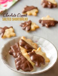 Instructions Preheat the oven to 350 degrees F, and line several baking sheets with parchment paper. Using an electric mixer cream the butter, sugar, and vanilla together until light and fluffy, 3-5 minutes. Scrape the bowl and beat again for 30 seconds. Sift the flour and salt together into a separate bowl. Then turn the mixer on low, and add the flour mixture a little at a time, until the dough comes together. Dump the dough onto a large sheet on plastic wrap. Flatten into a disk and wrap well. Place the dough in the fridge to chill for at least 30 minutes. Roll the dough out on a very well floured surface. Roll until it is 1/3-inch thick. Using a floured cookie cutter, cut out cookies and place on the parchment paper lined cookie sheets two inches apart. Try to cut out as many as possible from the first sheet of dough. Each time you gather and re-roll the dough, the cookies will get a little tougher. Bake for 20 minutes, until barely golden. Remove from the oven and immediately sprinkle with sea salt. Allow the cookies to cool completely. For the Chocolate: Set a glass bowl above a small sauce pot with about one inch of water to create a double-boiler. Heat the pot over medium heat. Place broken chocolate pieces and 1/2 tablespoon butter in the bowl. Stir as the chocolate melts. Remove the bowl from the pan. Dip each cookie half way in the chocolate. Use a spatula to scrape the excess chocolate off the back. Place the cookies back on the parchment paper or on a wire rack. Allow them to cool and harden. If you need the chocolate to set faster, place in the fridge for 15 minutes. Store in an air-tight container.